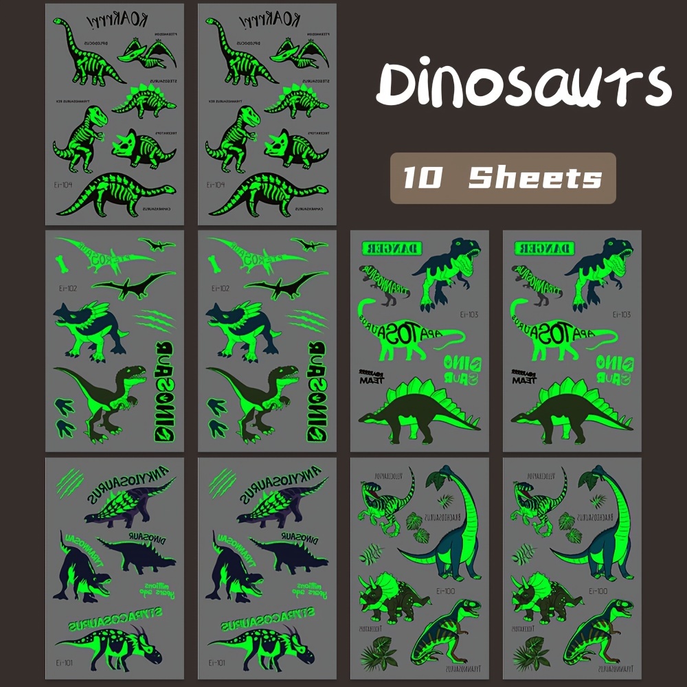 10 Sheets of Luminous Waterproof Glow-in-the-Dark Dinosaurs Temporary Tattoos, Featuring T-Rex, Pterosaur, Velociraptor, Triceratops, and Stegosaur Designs in Rectangular Shape, Perfect for Dinosaurs Birthday Party Supplies,